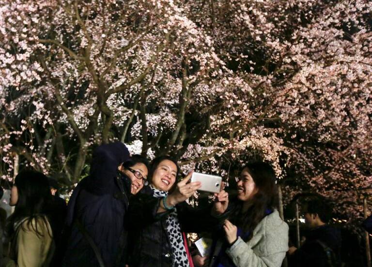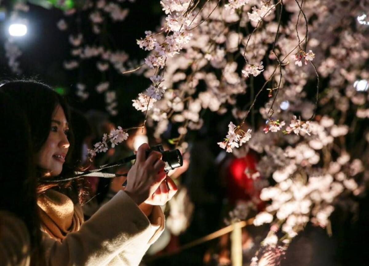 Una mujer toma las imágenes de un iluminado pendula Prunus o Shidarezakura flor de cerezo en los jardines de Rikugien en Tokio.