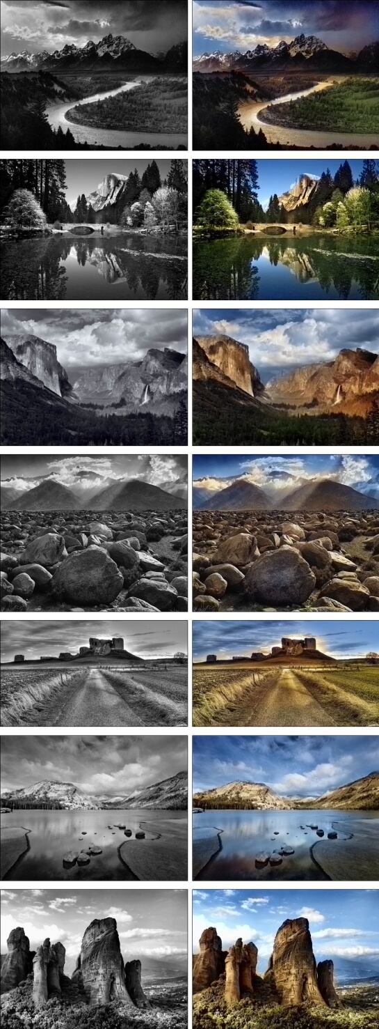 Aunque el algoritmo no es totalmente perfecto la aproximación a los colores realmente asombra a primera vista. Esta es una muestra de lo que logró el algoritmo, juzgue usted la colección de paisajes del conocido fotógrafo Ansel Adams.