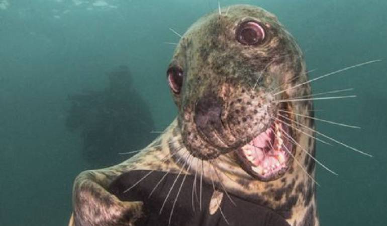 Pero si duda alguna la fotografía que se llevó todas las miradas y se robó más de una sonrisa fue la de esta foca, que se titula Hello Cheeky, donde se muestra al mamífero posando para la foto mientras sujeta la aleta del buzo.