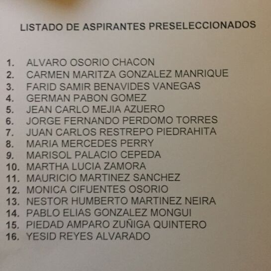 El siguiente es el listado de los 16 aspirantes preseleccionados dentro de la convocatoria pública para la integración de la terna de candidatos a Fiscal General de la Nación, que se entregó desde la presidencia al primer mandatario, Juan Manuel Santos: