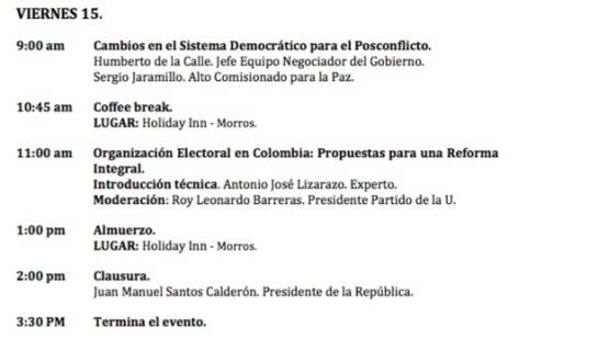 El encuentro llamado “La ruta de las reformas políticas de los acuerdos de paz” tiene como protagonistas a los negociadores del Gobierno que discuten con las Farc en Cuba, congresistas, juristas, ministros del Posconflicto y del Interior, así como al presidente Juan Manuel Santos quien será el encargado de clausurar el conversatorio.