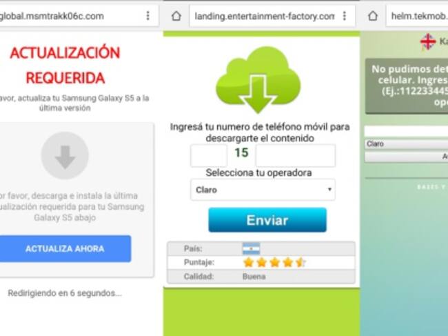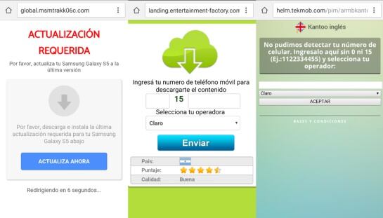 Una vez que el usuario comparte el mensaje con sus contactos, y debería poder activar la funcionalidad, recibe un mensaje donde se le comunica que su teléfono está desactualizado y sino realiza la actualización no podrá acceder a las videollamadas. Cuando se accede a la actualización, deberá ingresar su número de teléfono y, sin saberlo, se estará suscribiendo a alguno de los diferentes servicios de mensajes Premium.