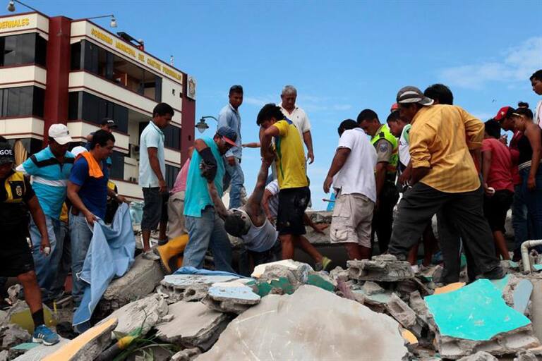 • Pobladores rescatan un cuerpo entre los escombros en la localidad de Pedernales.