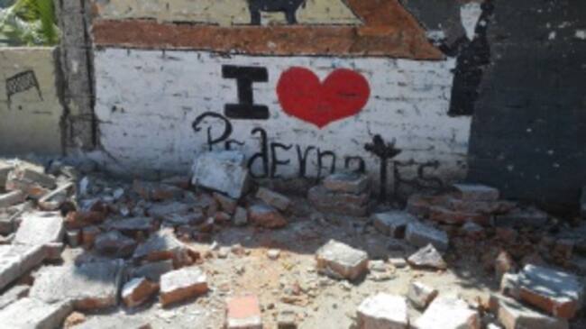 Luego nos dirigimos al sector de Tarqui, en donde la mayoría de los hoteles están en el piso y el olor se hace más intenso porque es el sitio de la ciudad en donde murió más gente. Algunas de las casas aledañas están ladeadas, se pueden ver las rejas de las ventanas del segundo piso dobladas por el desplome de la tercera planta y los postes caídos formando un enredo de cables en cada cuadra.