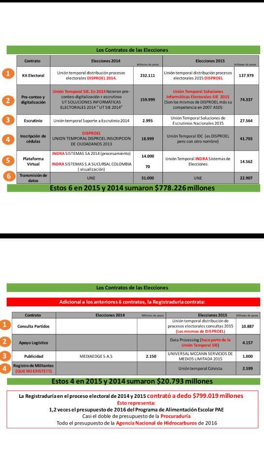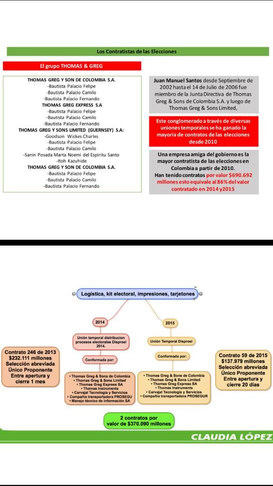 Y agregó que “en 2002 a Disproel le dieron contratos a dedo por 55 mil millones de pesos, les fue bien y en 2010 les volvieron a dar contratos por 88 mil millones de pesos, a dedo. Eso le permitió a esa Unión Temporal pasar, en el 2014, a tener contratos por 230 mil millones y en 2015 por 137 mil millones. Los grandes amigos del presidente Santos son los grandes contratistas de la Registraduría Nacional”.