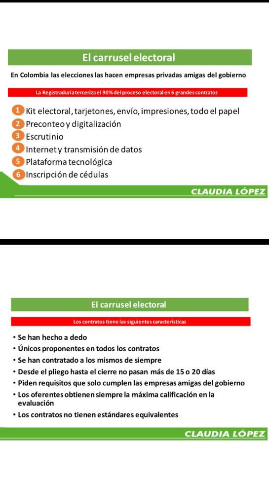 Durante un debate de control político en el Congreso sobre la situación de la Organización Electoral, la senadora Claudia López, denunció, según ella, que no se ha podido implementar el voto electrónico en el país porque “el cartel del la corrupción y contratación que tiene la Registraduría lo ha impedido. Este carrusel cuesta casi un billón de pesos y se contrata a dedo”.