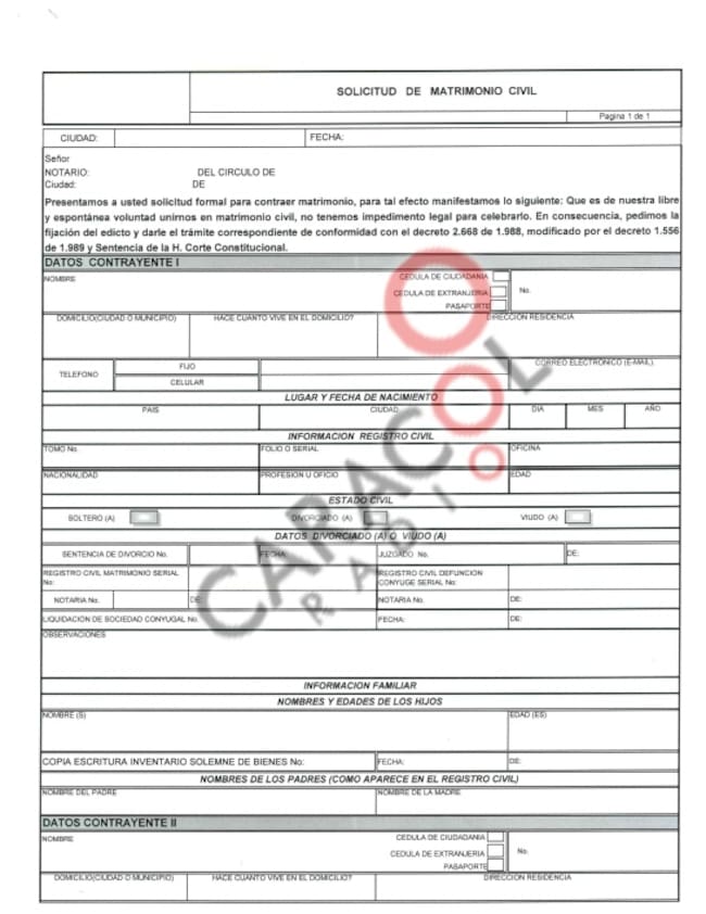 La solicitud de matrimonio civil identifica a los miembros de la pareja como contrayente I y contrayente II. Anteriormente se hacía por género: la y el contrayente.
