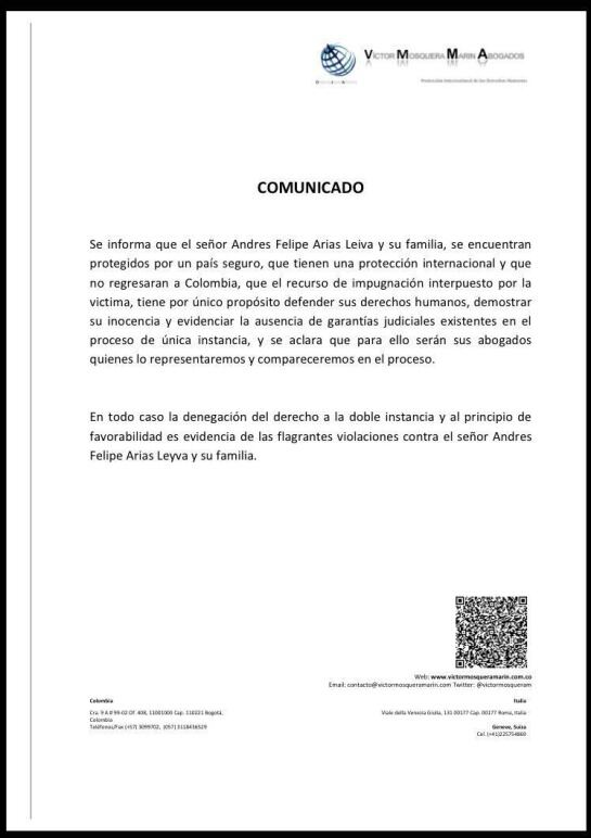 “Se informa que el señor Andrés Felipe Arias Leiva y su familia, se encuentran protegidos por un país seguro, que tienen una protección internacional”, asegura la comunicación.
