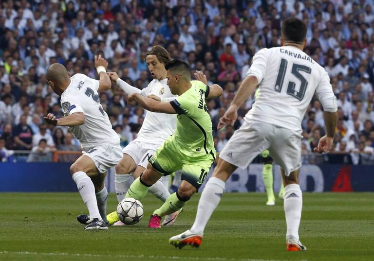 Agüero finta ante la marca de Modric y Pepe.