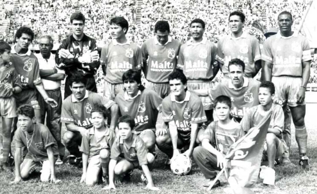 Arribe de izq a der: Alberto Gamero, Luis Barbat, Pedro 'El campero' Álvarez, Ricardo 'Chicho' Pérez, Augusto Vargas, Wilman Conde, Luis Carlos Perea. Abajo en el miso orden: Jhon Jaime 'La flecha' Gómez, Óscar 'Pájaro' Juárez, Lorenzo Frutos y Óscar Pareja.
