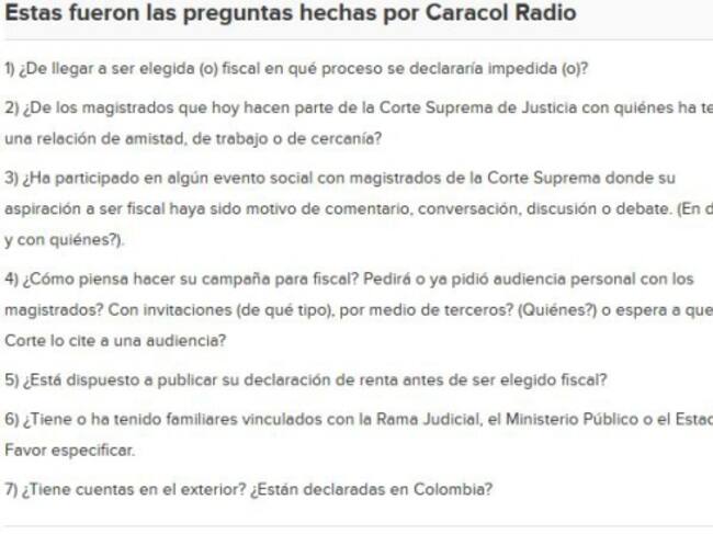 Caracol Radio preguntó por sus impedimentos, la campaña a la Fiscalía, sus bienes en Colombia y en el exterior y los vínculos laborales de sus familiares con el Estado.