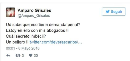 Ante la aparición en redes del documento de identidad de Amparo Grisales, la actriz reaccionó agresivamente en Twitter diciendo: “Usted sabe que eso tiene demanda penal?, Estoy en ello con mis abogados !!, Cuál secreto imbécil?, Un peligro !!”.