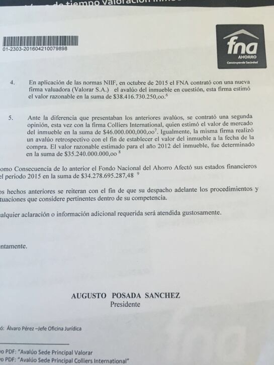 Según la misiva, el 8 de marzo de 2012, cuando el presidente era Ricardo Arias Mora, el fondo celebró un contrato de compraventa del predio por $79.000 millones de pesos. El valor fue acordado teniendo en cuenta el avalúo que hizo en ese momento la firma Valor S.A., que lo estimó en $79.268.391.000.