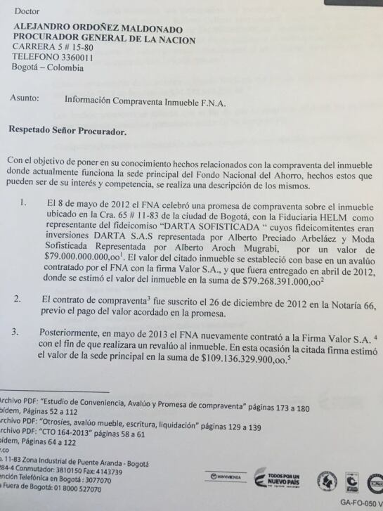 “Como consecuencia de lo anterior el Fondo Nacional del Ahorro afectó sus estados financieros en el período 2015 en la suma de $34.278.695.278,48” señala Posada en su misiva en la que pide al Procurador “que su despacho adelante los procedimientos y actuaciones que considere pertinentes dentro de su competencia”.