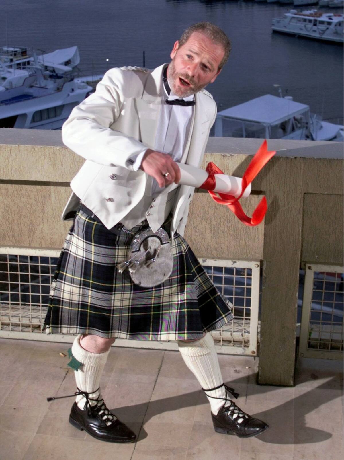 El actor británico Peter Mullan bromea para las cámaras después de recibir el premio al mejor actor por su papel en la película "Mi nombre es Joe", dirigida por Ken Loach en el festival de cine de Cannes - 24 de mayo de 1998.