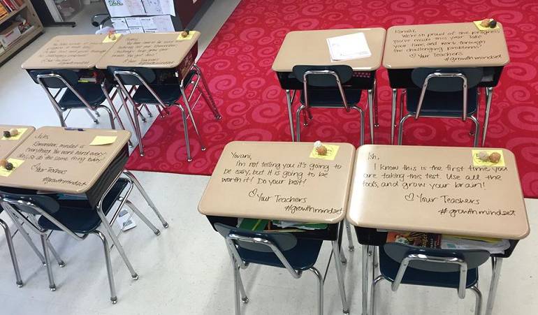 La docente plasmó mensajes motivantes en los pupitres de cada alumno para motivarlos antes de cada prueba.