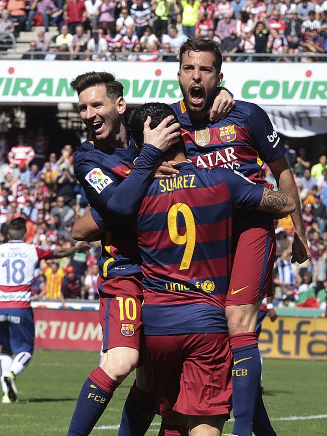 Foto 8 de 9El delantero uruguayo del FC Barcelona Luis Suárez celebra con sus compañeros, el defensa Jordi Alba y el delantero argentino Leo Messi.