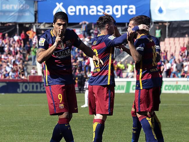 Foto 5 de 9El delantero uruguayo del FC Barcelona Luis Suárez celebra con sus compañeros, el delantero argentino Leo Messi y el defensa Jordi Alba