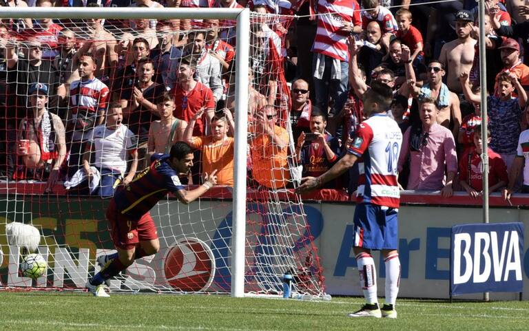 El delantero uruguayo del FC Barcelona Luis Suárez celebra el primer gol ante el Granada