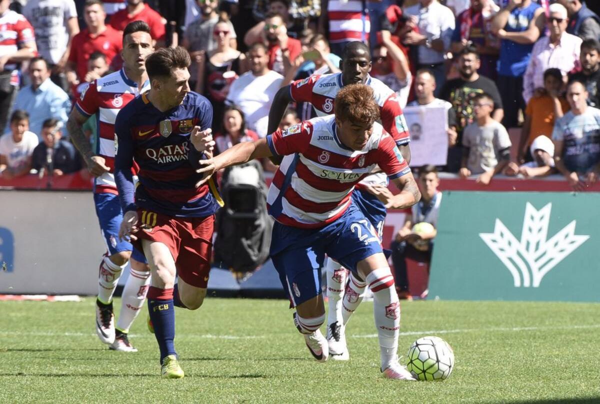 El delantero argentino del FC Barcelona Leo Messi disputa un balón con el delantero venezolano Adalberto Peñaranda, del Granada