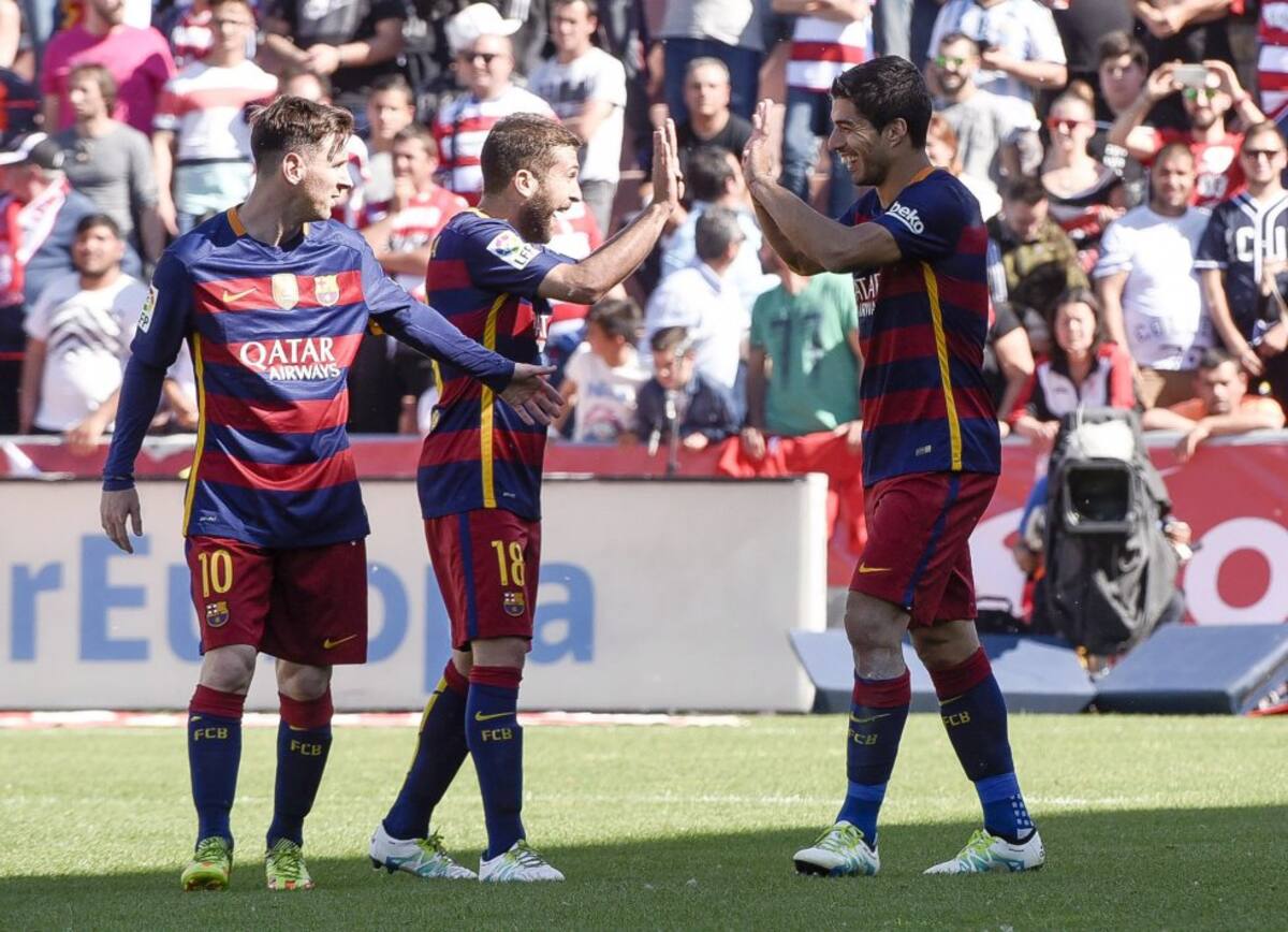 El delantero uruguayo del FC Barcelona Luis Suárez celebra con sus compañeros, el defensa Jordi Alba y el delantero argentino Leo Messi.