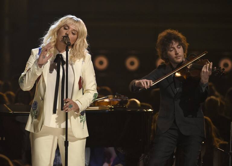 Kesha ofreció una conmovedora versión de 'It Ain't Me Babe' de Bob Dylan. Vestida con un traje color crema, cantó en compañía de un piano y un violín.