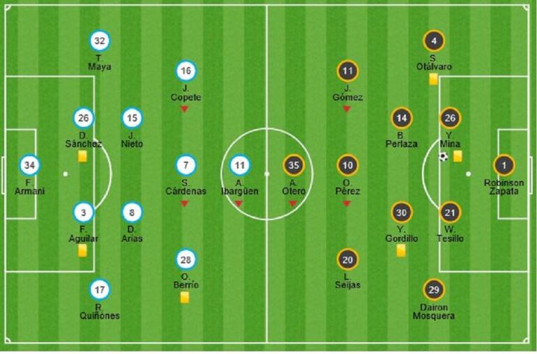 La primera y única anotación llegó a los 17 minutos del primer tiempo. Conocida, pero efectiva fórmula. Centro de Omar Pérez y potente cabezazo de Mina en el aérea para vencer a Armani que se vio comprometido en la anotación.