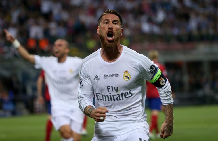 El jugador del Real Madrid Sergio Ramos celebra después de anotar el gol del 1-0