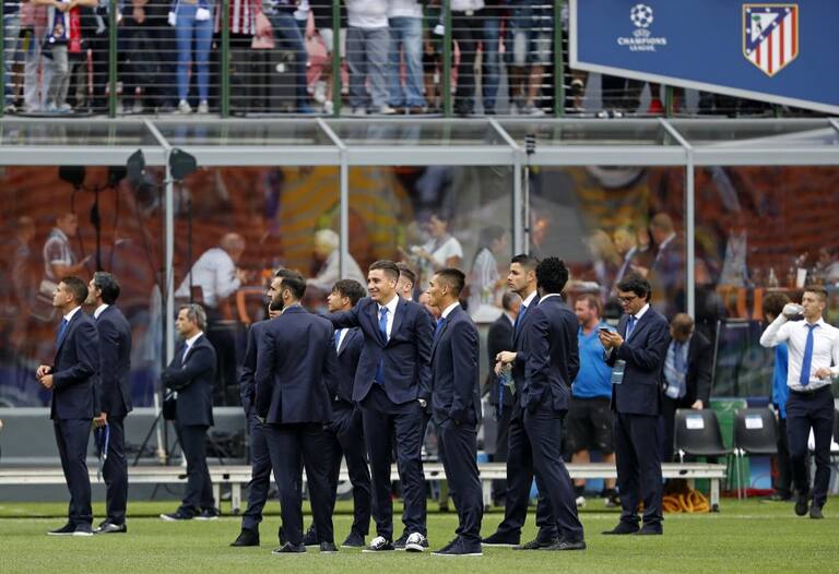 os jugadores del Atlético de Madrid Jesús Gámez (c-i) y el uruguayo José Mª Giménez (c) antes de la final de Liga de Campeones