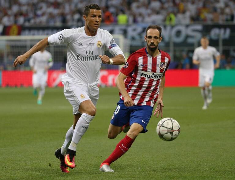 El jugador del Real Madrid Cristiano Ronaldo (L) en la acción con el Atlético Juanfran