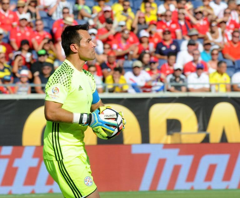 El arquero paraguayo Justo Villar con el control del balón.