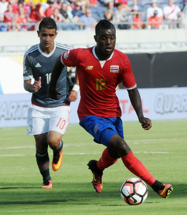 Joel Campbell con la posesión del balón durante el compromiso.
