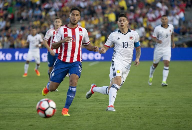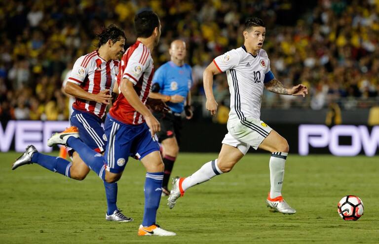James Rodríguez ante la marca de dos futbolistas paraguayos