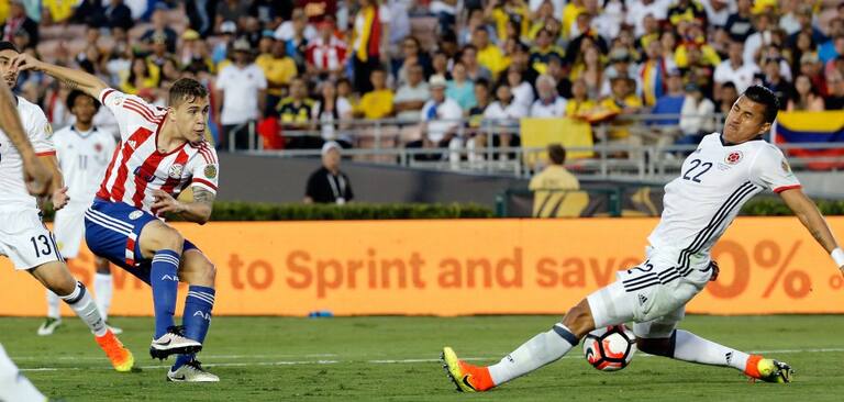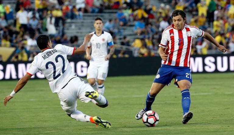 Robert Piris ante Jeison Murillo durante Colombia Vs. Paraguay