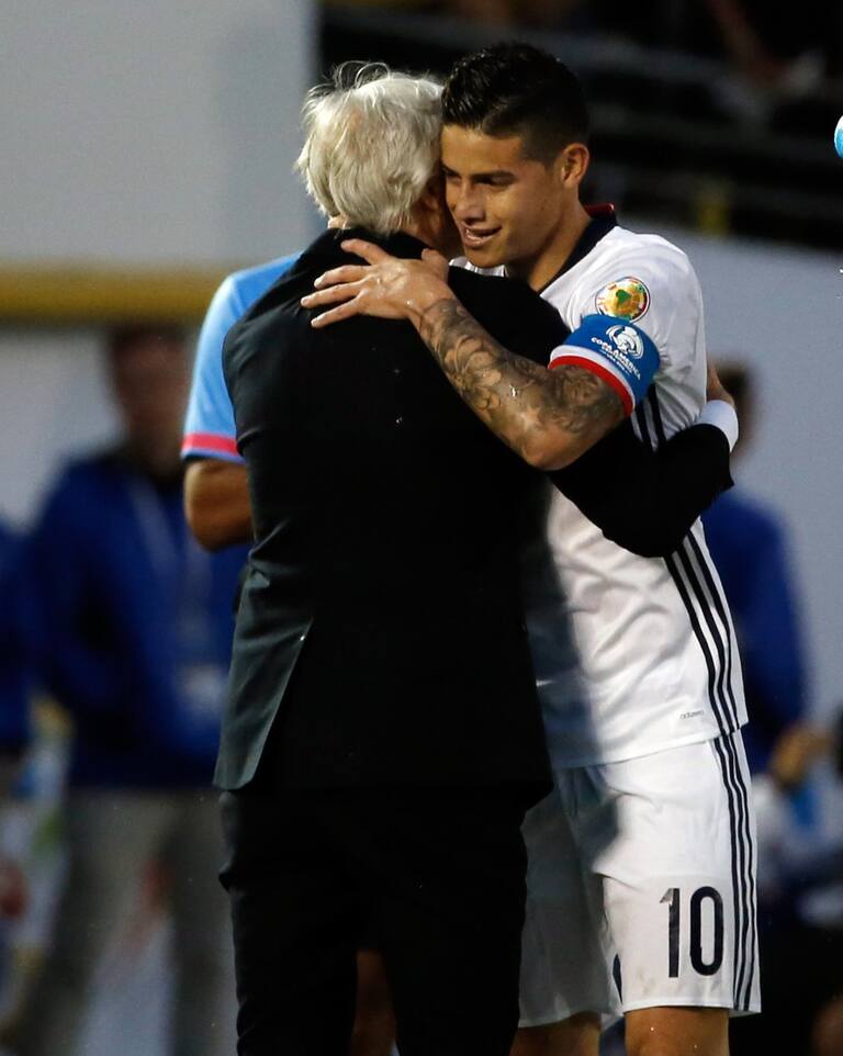 James Rodríguez y José Pékerman celebrando el segundo gol de Colombia