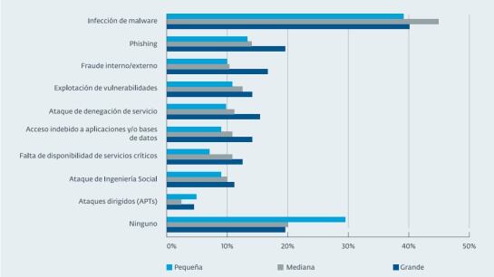 Según un estudio realizado por Eset la “Infección por malware” ocupa el primer lugar con el 40 por ciento de respuestas afirmativas, mientras que en segunda posición se ubican los casos de “Phishing” con el 16 por ciento y en la tercera el “fraude interno/externo” con el 13 por ciento.