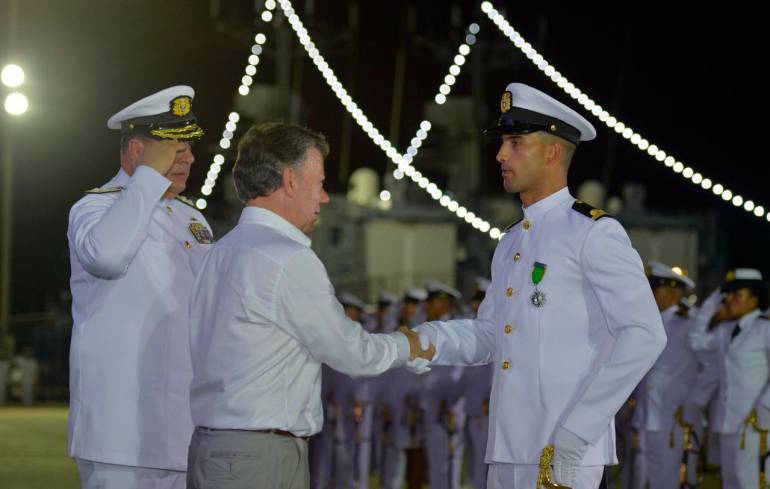 “La salida negociada no es claudicar ante el terrorismo, claudicar sería insistir en esta tragedia por más tiempo. Y así como su sacrificio nos trajo a este puerto de destino, la Colombia en paz los va a necesitar más que nunca”, aseveró Santos, en la ceremonia donde ascendieron a tenientes de corbeta y subtenientes 76 marinos, 55 guardamarinas y 21 alféreces.