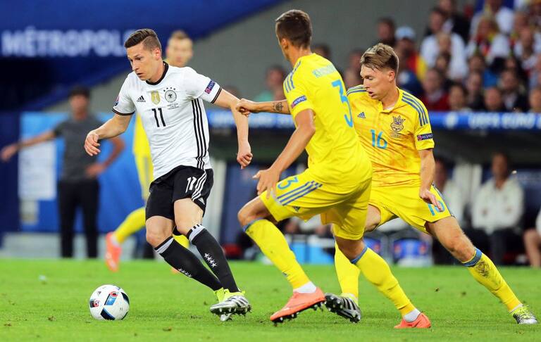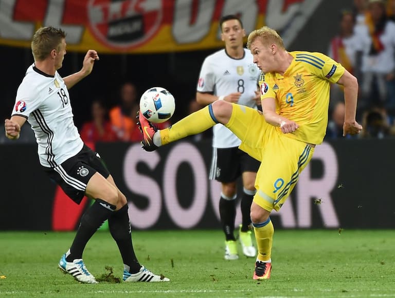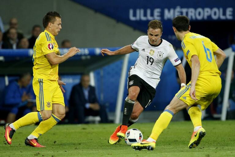 Gotze engancha ante la presión de dos rivales ucranianos.