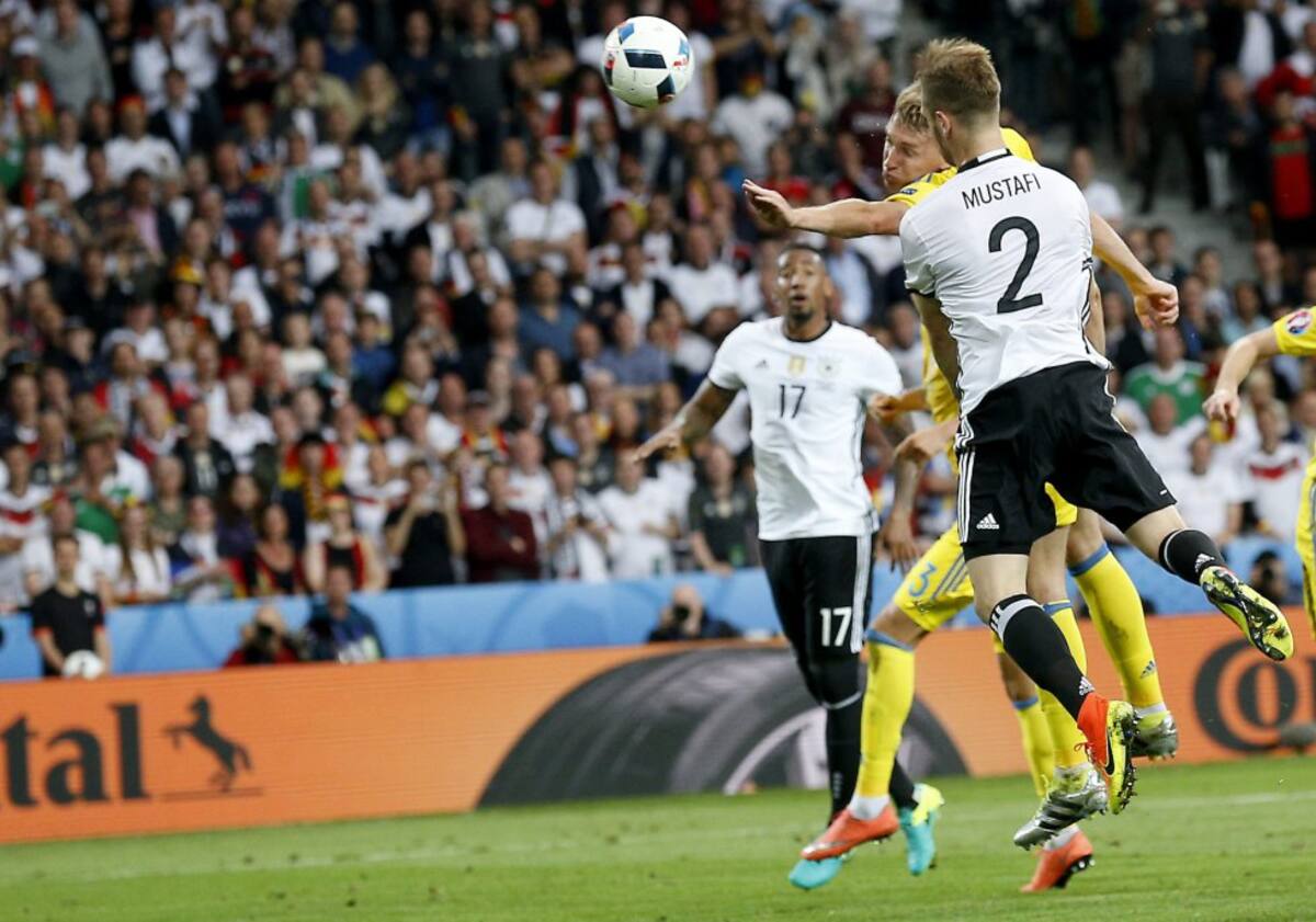 Mustafi aprovecha un tiro libre de Kross y marca el 1-0 para Alemania.