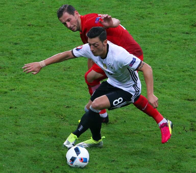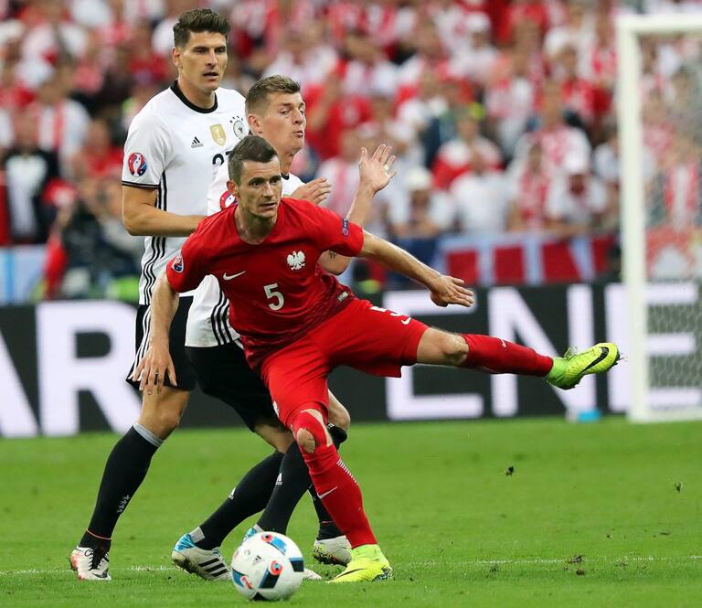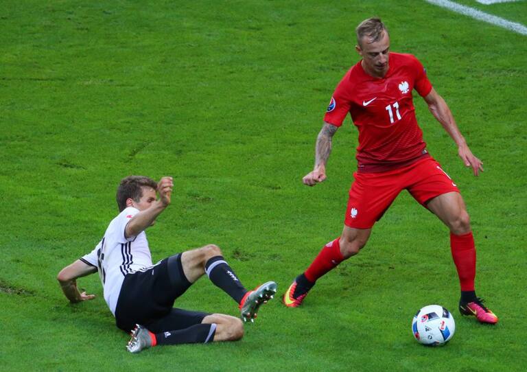 Muller tratando de quitarle el balón a Grosicki.