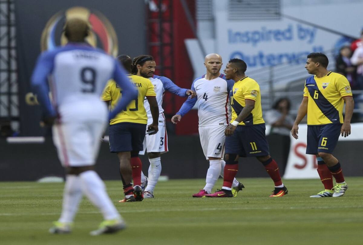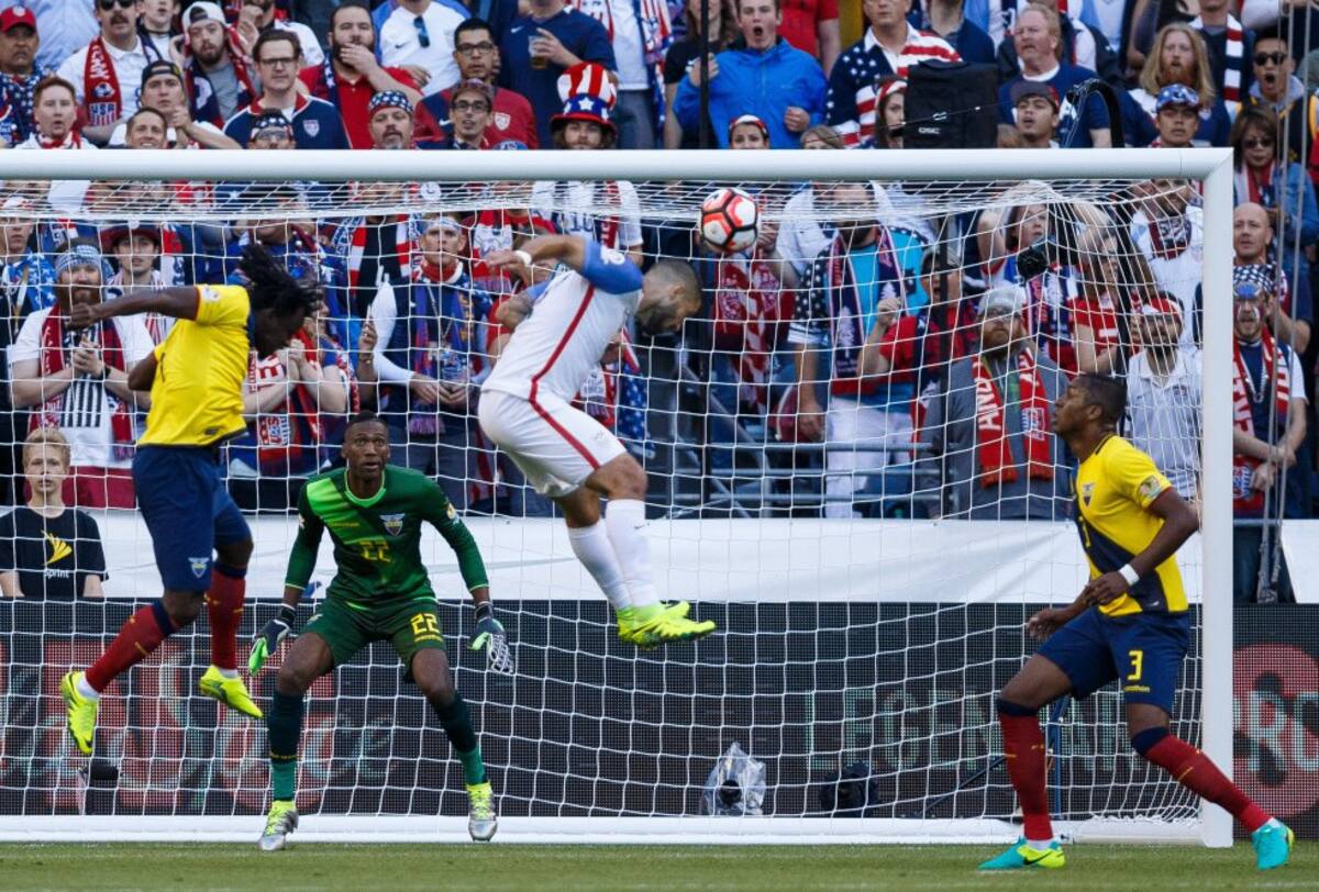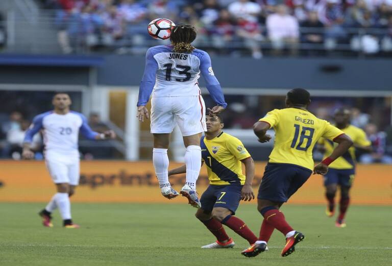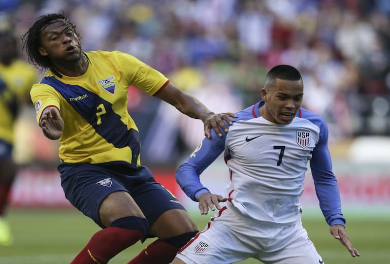 Bobby Wood de EE.UU. disputa el balón con Arturo Mina de Ecuador