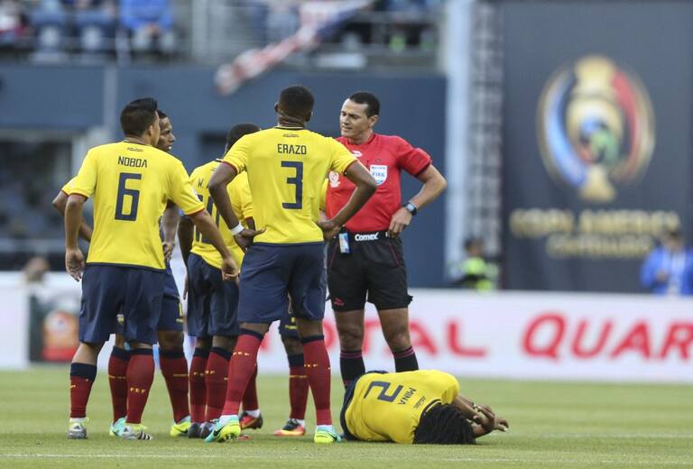 Michael Arroyo (c) de Ecuador discute con Wilmar Roldán (d) árbitro de Colombia