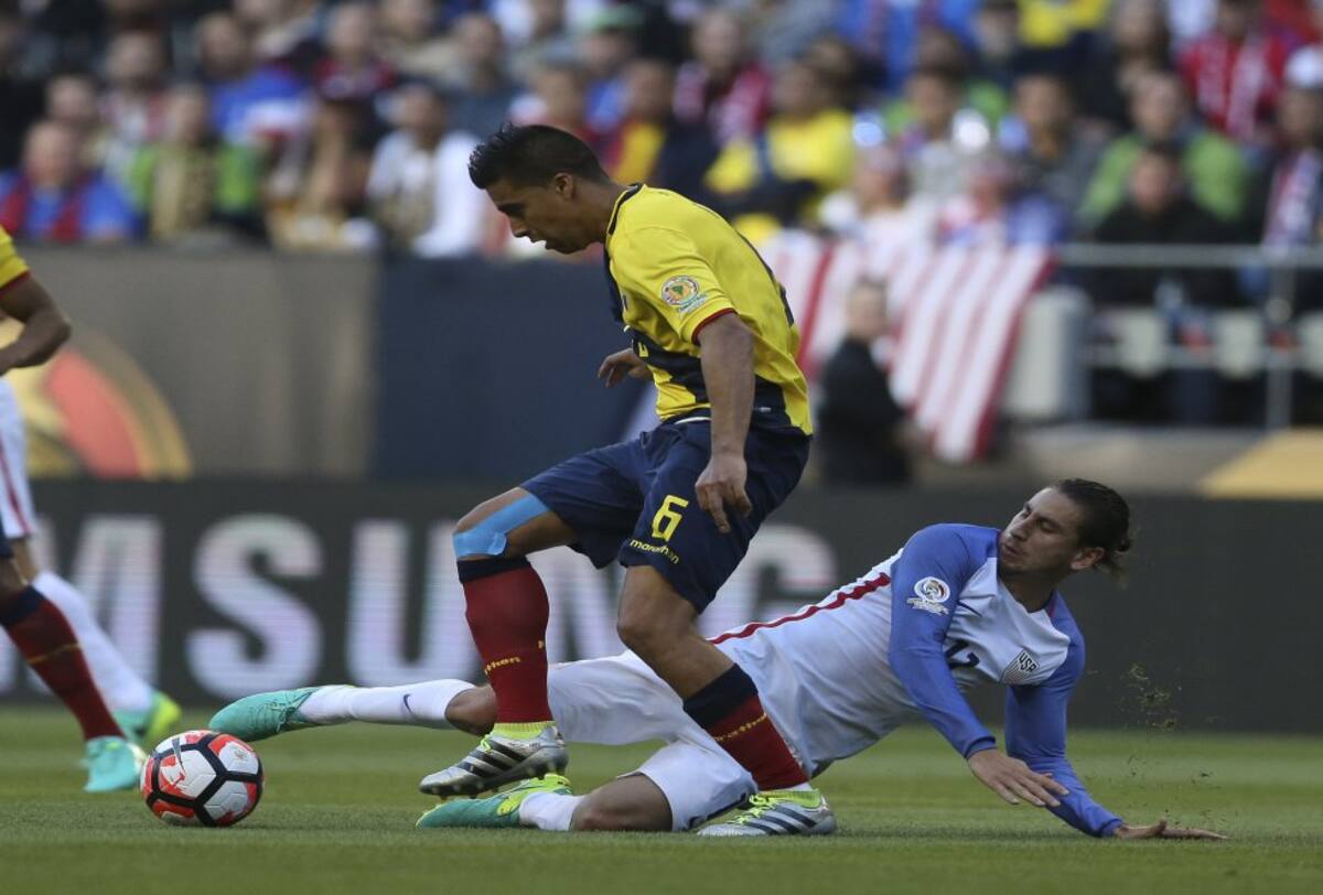 Alejandro Bedoya de EE.UU. disputa el balón con Christian Noboa de Ecuador