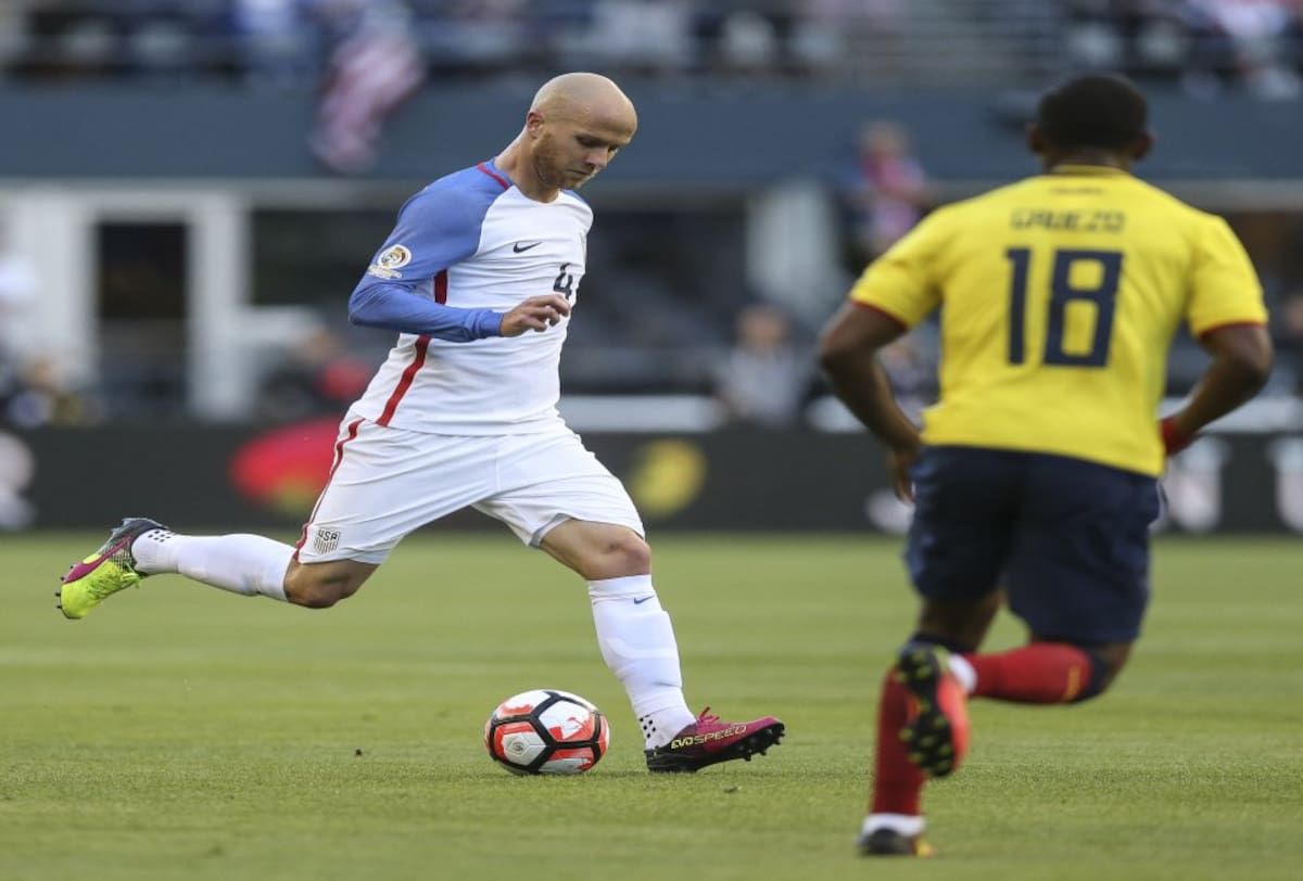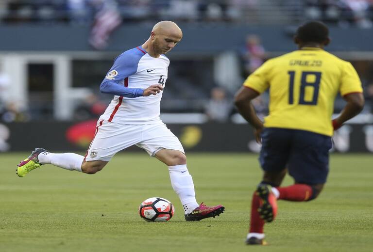 Michael Bradley de EE.UU. disputa un balón con Carlos Gruezo de Ecuador