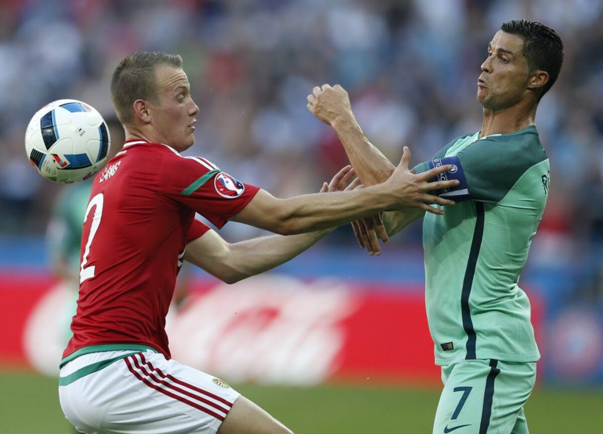 Cristiano Ronaldo y Adam Lang de Hungría disputan la pelota.