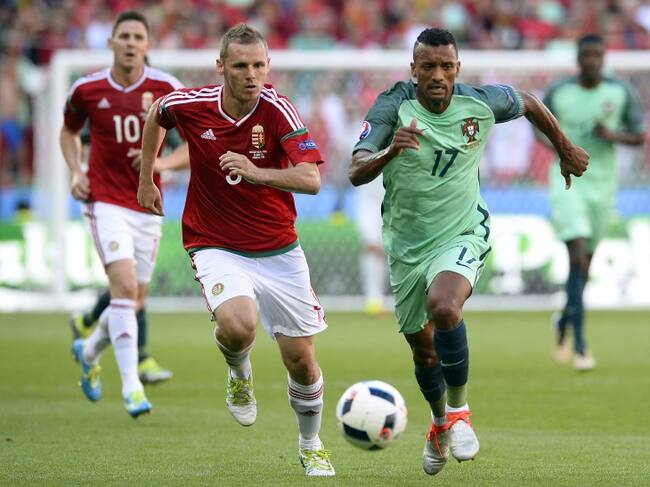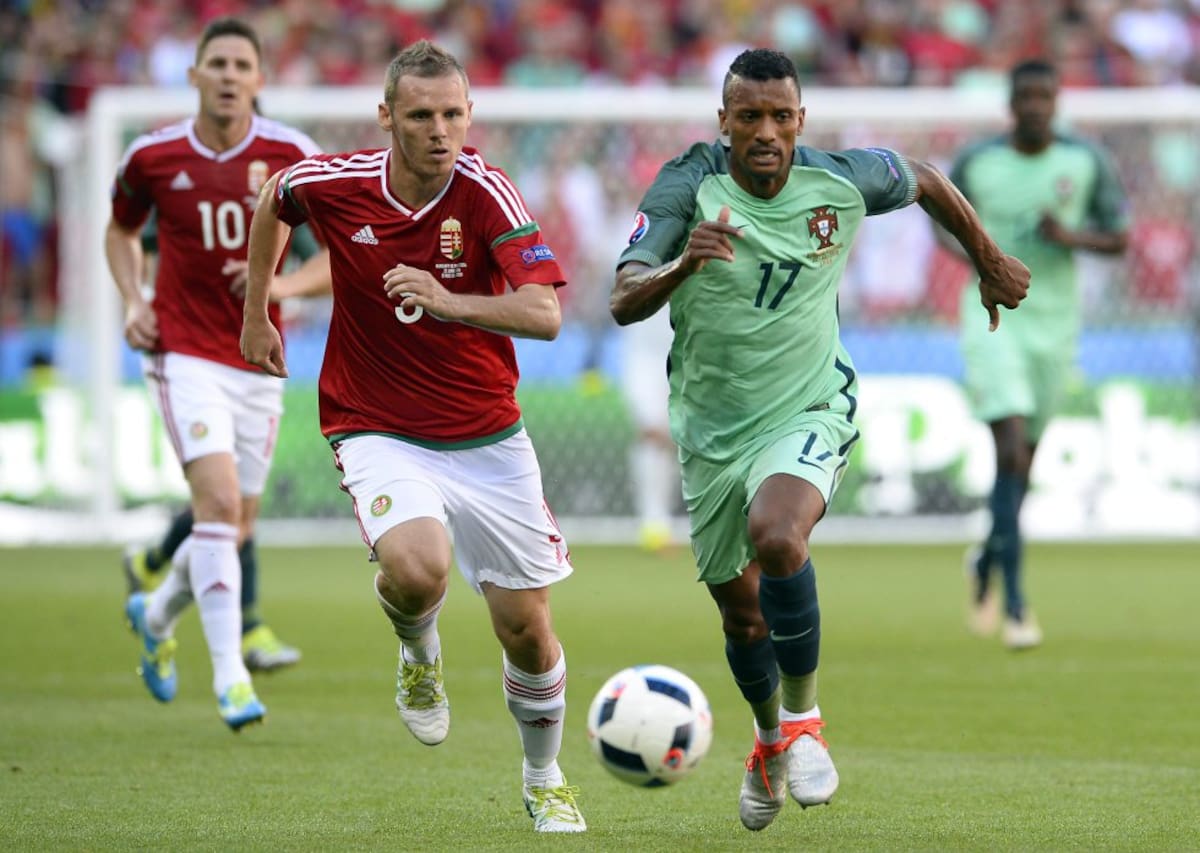 Mihaly Korhut de Hungría y Nani de Portugal durante el juego por la tercera fecha del Grupo F.