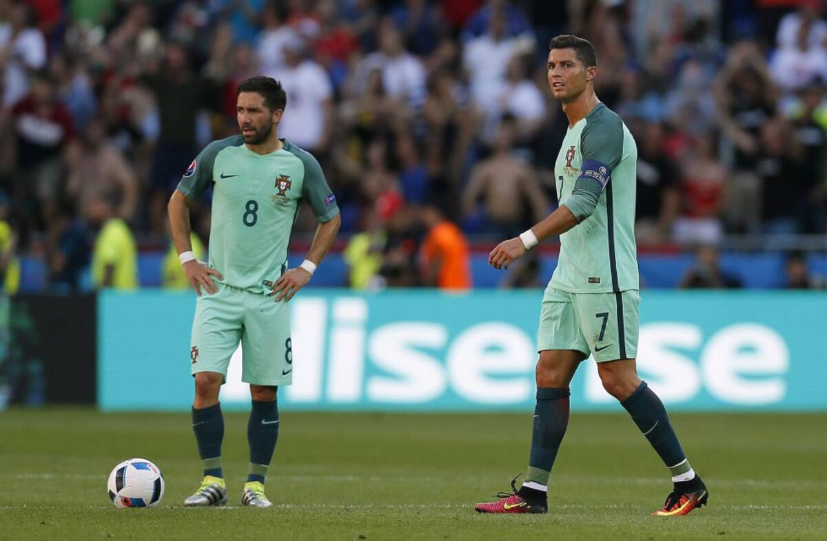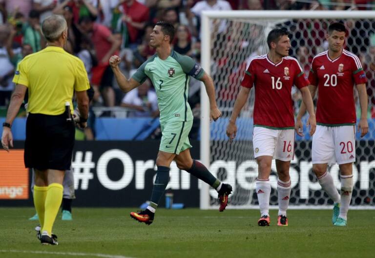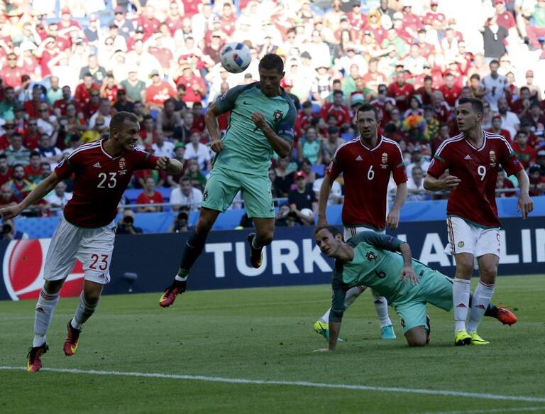 Cristiano Ronaldo y Joao Moutinhoen el saque después del 0-1 para Hungría.