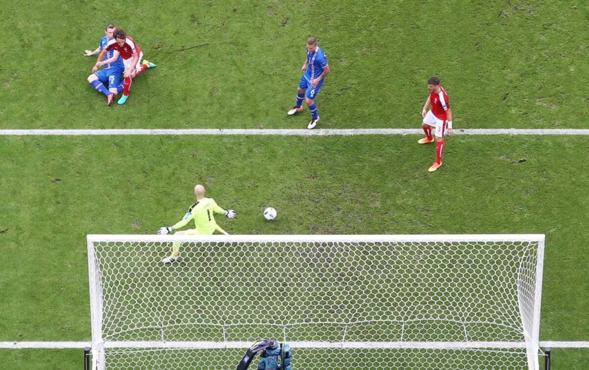 El festejo de Halldórsson luego del penal fallado de Austria