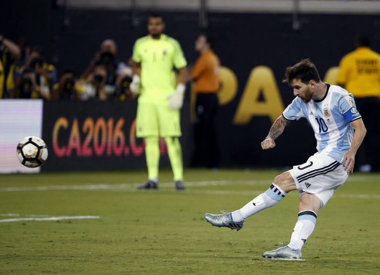 Pasos lentos y mirada al piso caracterizaron el regreso de Messi al centro del campo tras errar su cobro de penalty.