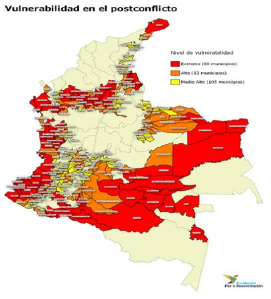 El primero es que de los 1103 municipios que tiene el país, las guerrillas operan en 281, es decir el 24%. En dicho grupo de municipios vive algo más del 16% de la población. De estos 281 municipios en 190 hay presencia de economías ilegales ya sea cultivos de hoja de coca, minería criminal o contrabando de gran escala, además en 160 de estos municipios existe presencia de otros grupos armados ilegales o actores criminales. Aquí se puede ver el mapa de los 281 municipios. En rojo se ven los de mayor vulnerabilidad, en naranja de vulnerabilidad alta y amarillo vulnerabilidad medio alto.